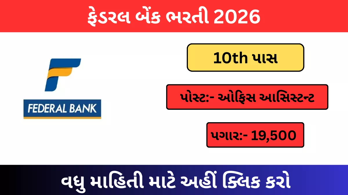 Federal Bank Office Assistant Recruitment 2026: ગુજરાત સહિત દેશભરના યુવાનો માટે ખુશખબર! Federal Bank દ્વારા Office Assistant (Subordinate Staff)ની ભરતી 2026 માટે નોટિફિકેશન જાહેર કરવામાં આવ્યું છે. આ ભરતીમાં કુલ જગ્યાઓની સંખ્યા હજુ જાહેર થયેલી નથી, પરંતુ વિવિધ બ્રાન્ચમાં પોસ્ટિંગ મળશે. માત્ર 10th પાસ ઉમેદવારો અરજી કરી શકે છે (ગ્રેજ્યુએટ્સ અયોગ્ય છે). ઓનલાઈન અરજી પ્રક્રિયા 30 ડિસેમ્બર 2025થી શરૂ થઈ ગઈ છે અને 8 જાન્યુઆરી 2026 છેલ્લી તારીખ છે. જલ્દી અરજી કરો અને બેંકિંગ કારકિર્દીની શરૂઆત કરો!